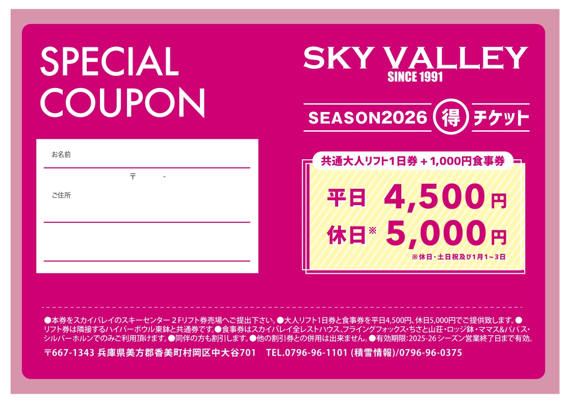 | 郵送先 | 〒667-1343 兵庫県美方郡香美町村岡区中大谷701 スカイバレースキー場 電話0796-96-0375  |