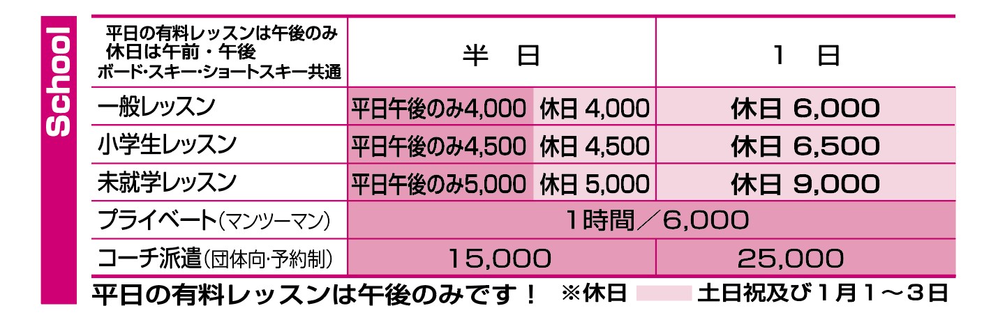 ※平日のスキー有料レッスンは、スタッフ不足の為実施出来ないことがあります。